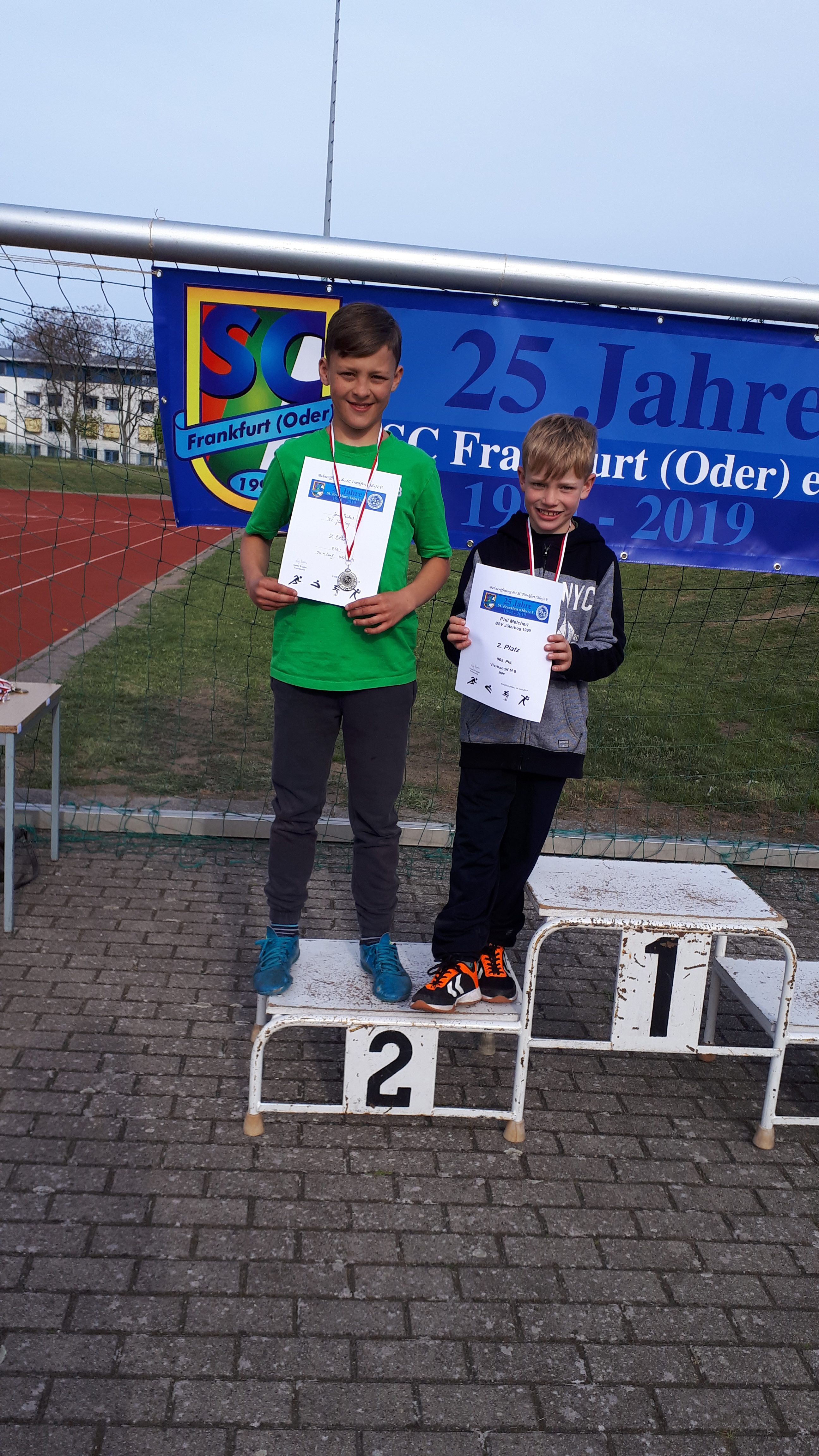 Phil Melchert ( AK 8) war ganz besonders vor seinem ersten Freiluftvierkampf aufgeregt. Er hatte 50m, Medizinballstandstoß, Weitsprung und 400m zu absolvieren. Vor dem abschließenden 400m war er Zweiter. Nach einem ganz tollen und kämpferischen 400m-Lauf konnte er seinen 2. Platz verteidigen. Die Freude auf dem Siegerpodest war ihm anzusehen.