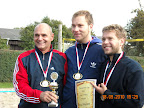 Zum Abschluss der Beachvolleyballsaison fanden sich 5 Teams des SSV Jüterbog auf dem SSV-Beachvolleyballplatz auf dem Gelände der Firma Sausewind ein, um zum vierten Mal den Sieger im Dreierturier zu ermitteln. Die 15 Volleyballer wurden in 3 Lostöpfe eingeteilt. Aus diesen Töpfen ergaben sich die Mannschaften. Jedes Team absolvierte 4 Spiele. Anvisiert wurden zwei 15-er Gewinnsätze. Das beste Team an diesem Tag waren die Spieler Benjamin Kropp, Michael Graf und Sascha Kubau. Sie gewannen alle 4 Spiele und konnten den Wanderpokal und die Goldmedaillen in Empfang nehmen. Den zweiten Platz sicherten sich Sebastian Malinowski, Frank Braune und Fred Zeige. Diese 3 Spieler hatten zwei Siege und zwei Niederlagen auf dem Konto. Die beiden Niederlagen waren äußerst knapp. Sie hätten das Turnier auch gewinnen können. Den 3. Platz belegten Maria Langnickel, Ralf Mund und Bernd Hofmann. Das Team legte einen katastrophalen Fehlstart hin. Die ersten beiden Begegnungen gingen klar verloren. Die beiden letzten Spiele sicherten sie sich eindeutig. Platz 4 ging an die Spieler Daniel Matthay, Florian Zeige und Maxie Wohlauf. Reiner Voigt, Felix Preuß und Susi Ortscheid landeten am Ende auf den 5. Platz. Der Verein bedankte sich bei Markus Schulze und Grillmeister Peter, der jede Woche für die Vereinsmitglieder am Grill stand.
