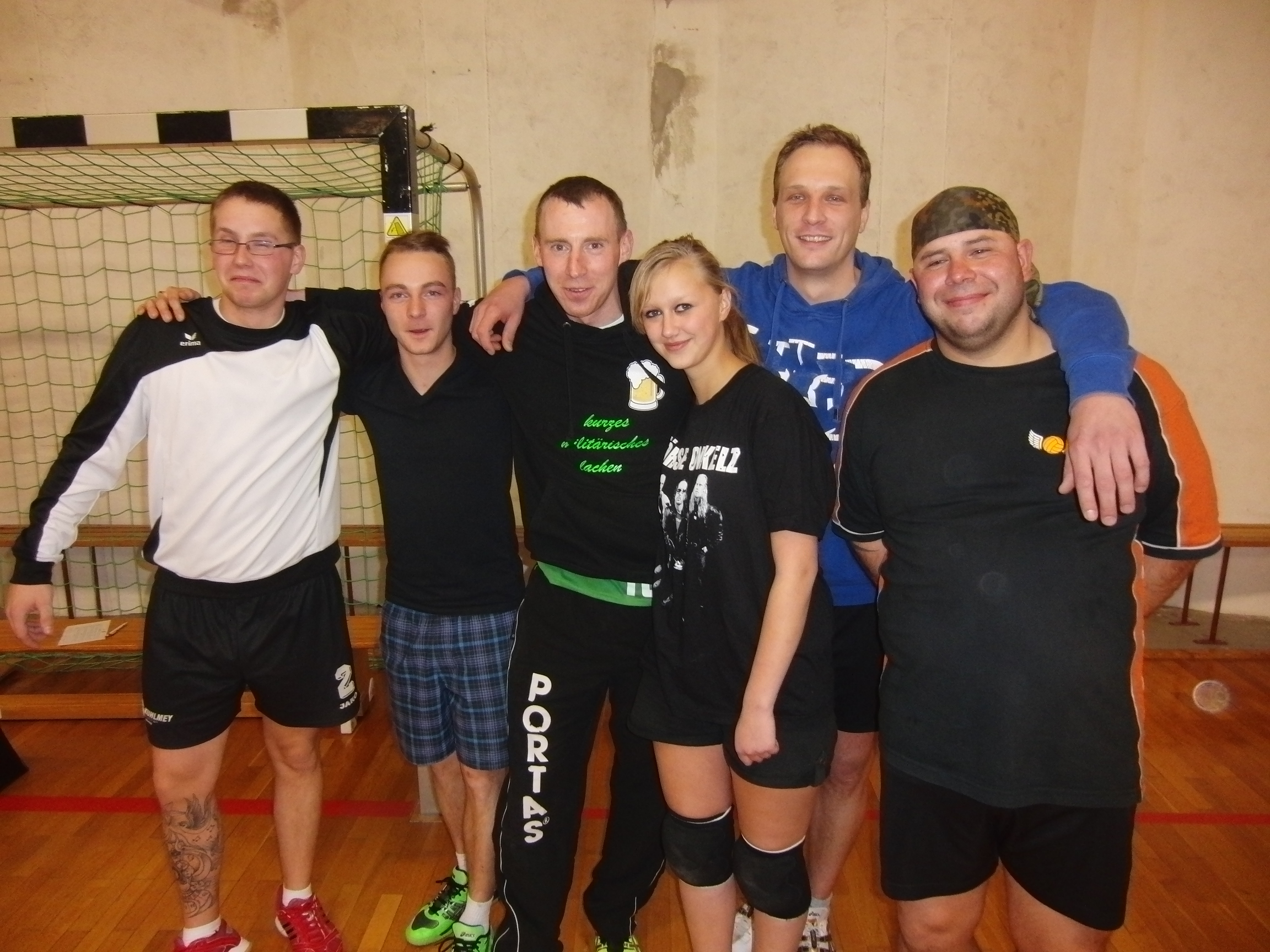 Operation Knackwurst gewinnt erneut. 7 Mixteams erschienen in der Sporthalle „Neuheimer Weg“ zum freudvollen Ausgang des Sportjahres 2013. Die Veranstalter vom SSV rechneten im Vorfeld nicht mit einer so großen Resonanz. Gespielt wurde zunächst in einer Dreier- und einer Viererstaffel. Nach der Vorrunde entschieden sich die Mannschaftskapitäne mehrheitlich für eine Halbfinalrunde. Der SSV- Sechser behauptete sich dank der kleinen Punkte mit 1:1 Sätzen gegen das Team „Fürchtet uns“. Noch spannender war die zweite Halbfinalbegegnung zwischen „Einfach wir“ und Operation Knackwurst. Nach Sätzen hieß es 1:1. Auch hier entschieden die kleinen Punkte für Operation Knackwurst. Damit standen auch sie im Finale. Den 5. Platzt sicherten sich Elbor. Sie gewannen 2:0 gegen Rot-Weiß Jüterbog II. Das hochklassige kleine Finale entschied „Einfach wir“ mit 2:1 Sätzen gegen „Fürchtet uns“. Im Finale konnten die bis dahin ungeschlagenen SSV-Spieler nicht mehr an die sehr guten Vorleistungen anknüpfen. Operation Knackwurst steigerte sich auf Grund einer taktischen Umstellung. Mathias Jahnke wechselte auf die Hauptangreiferposition und konnte trotz ledierter Knie wesentlich zum Sieg beitragen.